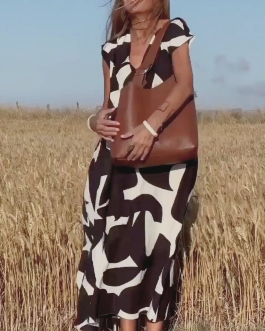 Light, flattering and easy to wear - a dress designed to elevate everyday moments with ease and style. Featuring a graceful V-neck that highlights your silhouette and a relaxed fit for effortless movement. The abstract pattern adds a bold, modern twist to your wardrobe - perfect for city strolls, casual dinners, or weekend getaways.