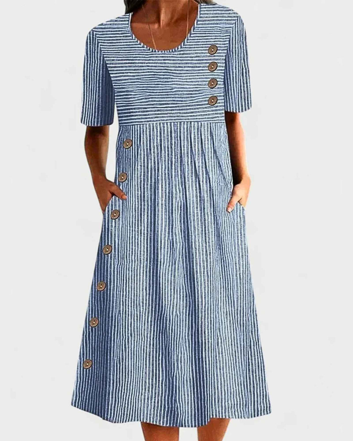 Chic meets simplicity in the Noa dress—a timeless striped midi made for effortless elegance. The soft, breathable fabric keeps you fresh all day, while the flattering silhouette flows gracefully with every step. Decorative buttons add a charming touch, and the 3/4 sleeves offer versatility for any season. From coffee dates to casual dinners, Noa is your everyday go-to.